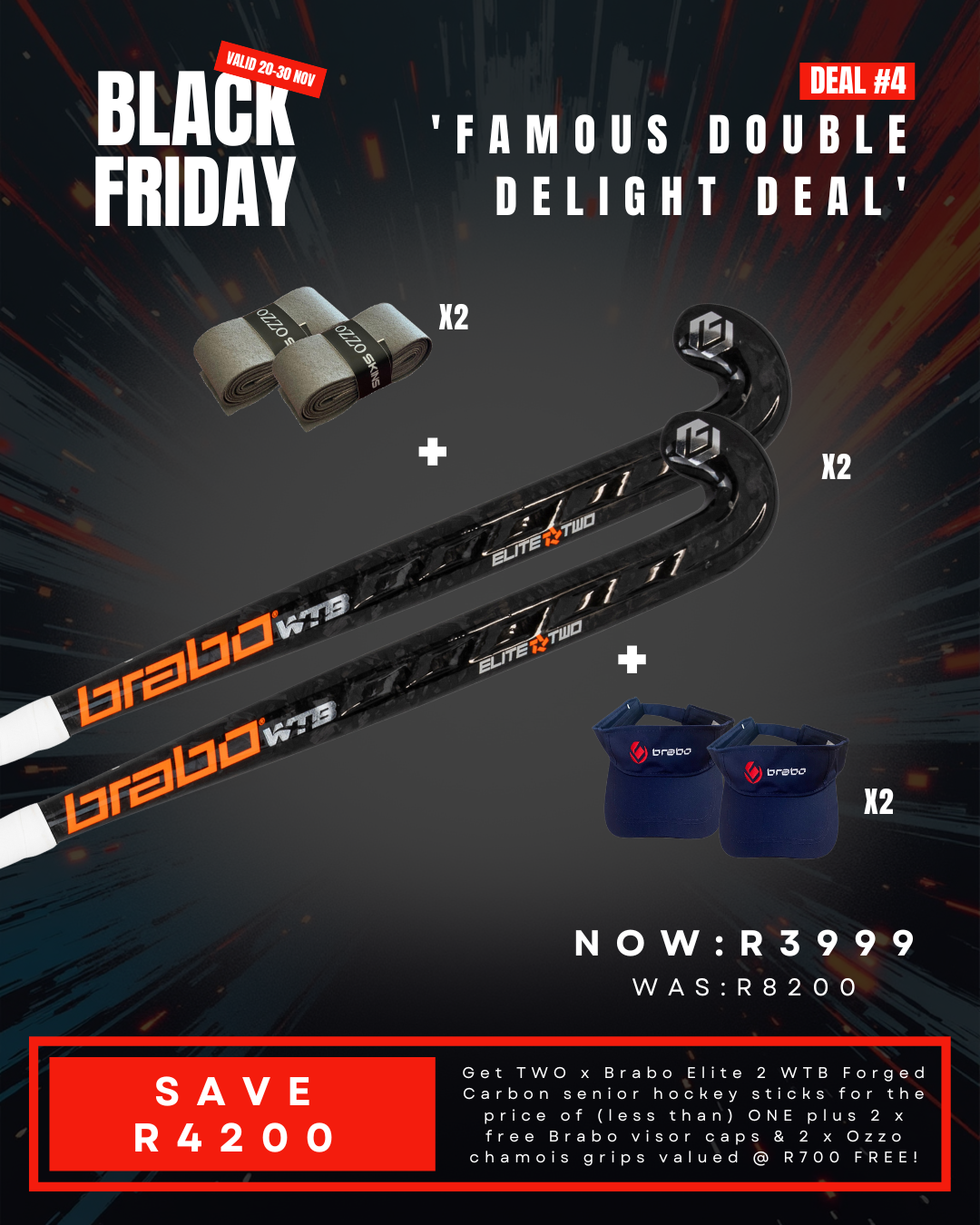 Get TWO x Brabo Elite 2 WTB Forged Carbon senior hockey sticks for the price of (less than) ONE plus 2 x free Brabo visor caps & 2 x Ozzo chamois grips valued @ R700 FREE!